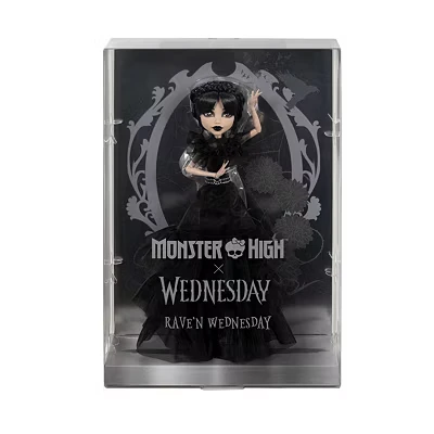 The Monster High x Wednesday collection pays tribute to the darkly witty and downright eerie television series with a screamium line of dolls. Woe what a night! Inspired by her character's vintage gown in the show's school dance scene, this Rave'N Wednesday doll makes goth glam in a midnight black dress. Dark as her sense of humor, Rave'N Wednesday's organza dress has sheer layers that look spun from shadows. A statement belt and Monster High earrings complete her wickedly chic look. She's ready to step into a nightmarish night in her boo-spoke shoes! Their icicle and yeti heels pay homage to the Rave'N dance's theme: climate crisis meets extinction event. Check out the entire Monster High x Wednesday line for more delightfully dire dolls. They make memorable gifts for collectors and fans alike. Each sold separately, subject to availability., Manufacturer: Mattel