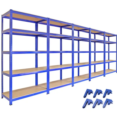 You need this metal racking in your life. These super strong garage racking units from our T-Rax range are made from hardcore steel and are designed to support a massive 280kg load per shelf. Their moulded rubber feet provide extra sturdiness to an already sturdy item You won't need to test your DIY skills to the max either as this garage shelving is super easy to put together. Not a screw or bolt in sight. All you need to assemble the garage shelving units is a rubber mallet. Aswell as being ideal for use in garages, workshops and sheds, these racks are also perfect for use in industrial warehouses. Strong, reliable and easy to build; this metal racking ticks all the boxes. Product Features 5 x T-rax 90cm Racking units 12 x FREE Bay connectors Sturdy rubber moulded feet Massive 280kg capacity per shelf Specifications: Height: 1800mm / 180cm / 70.9” Width: 900mm / 90cm / 35.4” Depth: 450mm / 45cm / 17.7” Material: Steel Colour: Blue Finish: Powder Coated Quantity: 5 Racks Capacity: