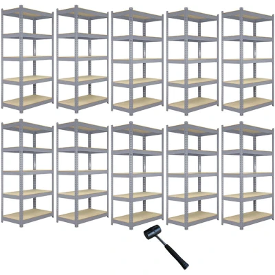 General description From storing bulky tools and spare pots of paint in the garage to housing your ever-growing collection of gardening supplies in the shed, these 10 x Q-Rax Grey Metal Racking Units will make a versatile addition to any household or workplace. Designed with a high-quality steel frame and durable 8mm thick MDF boards, which are moisture-resistant and splash-proof, this storage solution is reliable and built to last. Finished with four layers of powder-coated paint, these sturdy racking units will maintain their excellent condition for a long time. The smart boltless assembly system allows for easy setup, requiring only the included rubber mallet to slide the components into place and lock them together using the keyhole mechanism. The shelves are height adjustable, providing complete flexibility to maximize your storage options. Technical specifications Dimensions Per Rack: 90cm (w) x 182.5cm (h) x 50cm (d) Total Weight: 290kg Frame Material: Steel Shelf Material: 8mm