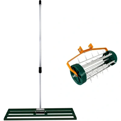 Elevate your lawn care routine with our versatile 2-in-1 manual lawn aerator and leveller bundle, designed to help you achieve a lush, healthy lawn while ensuring perfectly even landscapes. Combining two essential tools into one efficient package, this bundle allows you to seamlessly switch between aerating your soil and levelling your lawn, all with the convenience of a shared, extendable aluminium handle. The manual lawn aerator is expertly crafted to improve soil aeration, promoting healthier, stronger grass by allowing essential nutrients, water, and oxygen to reach the roots. With a generous width of 42cm and a height of 25cm, it covers a substantial area, making aeration quick and efficient. Large, sturdy wheels ensure smooth rolling across your lawn, even on uneven terrain, while the lightweight design enhances manoeuvrability. Equipped with sharp, 3.8cm spikes that effortlessly puncture the soil, this aerator ensures that your lawn gets the nutrients it needs for vibrant