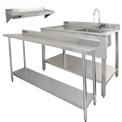 General description The 6ft Stainless Steel Catering Bench and Sink set is an essential bundle for any commercial kitchen. This versatile trio includes a spacious catering bench, a durable stainless steel sink, and two wall-mounted shelves, all designed to enhance your kitchen's efficiency and organization. The catering table features a weight capacity of 250kg and is perfect for keeping your workspace tidy while providing ample storage options. Technical specifications Catering Bench: Weight: 28.5kg Material: #403 Stainless Steel Height: 900mm / 90cm / 35.4” Width: 1800mm / 180cm / 72” Depth: 570mm / 57cm / 22.4” Shelves: Weight: 9.4kg Material: #403 Stainless Steel Height: 230mm / 23cm / 9.1” Width: 1250mm / 125cm / 49.2” Depth: 300mm / 30cm / 11.8” Sink Dimensions: 120cm wide x 60cm deep x 105cm high (including upstand & feet fully extended) Bowl dimensions: 44.7cm square x 28.2cm deep Installation Quick and easy assembly is ensured with all necessary components included for