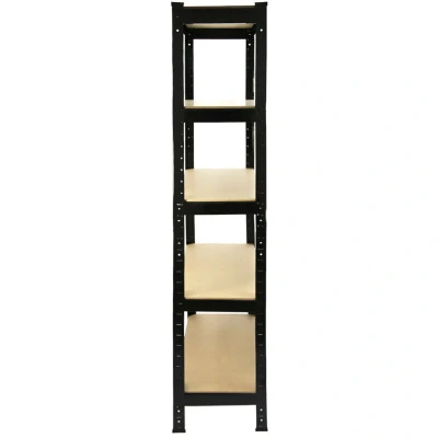 General description From storing bulky tools and spare pots of paint in the garage to housing your ever-growing collection of gardening supplies in the shed, these 5-tier heavy-duty shelving units will make a versatile addition to any household or workplace. Designed with a high-quality steel frame and durable 6.2mm thick MDF boards that are moisture-resistant and splash-proof, it's a storage solution you can rely on. Finished with four layers of black powder-coated paint, these sturdy racking units will maintain their excellent condition for a long time. The shelves are height adjustable, providing complete flexibility to maximize your storage options. Technical specifications Colour: Black Total Weight: 100kg Frame Material: Steel Shelf Material: 6.2mm Thick MDF Number of Shelves: 5 Weight Capacity Per Shelf: 150kg Height Per Rack: 150cm / 1500mm / 59.1” Depth Per Rack: 30cm / 300mm / 11.8” Width Per Rack: 75cm / 750mm / 29.5” Number of Racks: 8 Installation The racks feature a