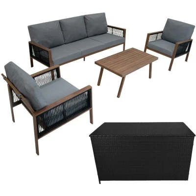 ManoManoGeneral description Elevate your outdoor living with this beautifully coordinated garden bundle, combining a sleek, wood-effect aluminium 4-piece sofa set with a spacious black rattan storage box. The set includes a generously sized three-seater sofa, two deep-cushioned armchairs, and a coordinating coffee table, offering ample space for hosting friends or enjoying peaceful moments outdoors. The striking wood-effect finish adds a warm, natural look, while the modern lines and neutral tones ensure seamless integration with any garden or patio aesthetic. Technical specifications Colour: Brown Wood Effect Total Weight: 55.1kg Frame Material: Aluminium Cushion Cover Material: Polyester Cushion Material: Foam Seat Back Height: 75cm / 0.75m / 29.5” Seat Height: 42.5cm / 0.43m / 16.7” Seat Depth: 82cm / 0.82m / 32.3” Sofa Width Including Arms: 201cm / 2.01m / 79.1” Sofa Width Excluding Arms: 191cm / 1.91m / 75.2” Chair Width Including Arms: 74cm / 0.74m / 29.1” Chair Width Excluding Arms: