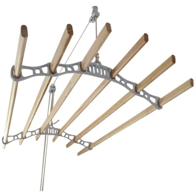 General description Want your home to look authentic, traditional, and homely? Care for the environment and want to reduce your carbon footprint? Our Clothes Airer instantly becomes a superb design feature in your home with no practicality lost. A truly innovative alternative to tumble-drying, the Clothes Airer raises your clothes to the ceiling where natural heat works to dry them within 2-4 hours. Specifically designed to be durable and strong, the 6 high-quality, ethically-sourced pine laths are able to withstand large clothing loads. The clear-coat varnished timber adopts a traditional appeal as they sit between the authentic cast-iron rack ends and pulleys whilst remaining strong and supremely long-lasting. Technical specifications Material: Ethically-sourced pine, cast iron rack ends, pulleys, and wheels, cotton rope Finish: Clear-coat varnished pine; powder-coated cast iron Dimensions: 200cm (L) x 56cm (W) x 14cm (H) Weight: 4.8kg Installation Easy-to-fit on most ceilings,