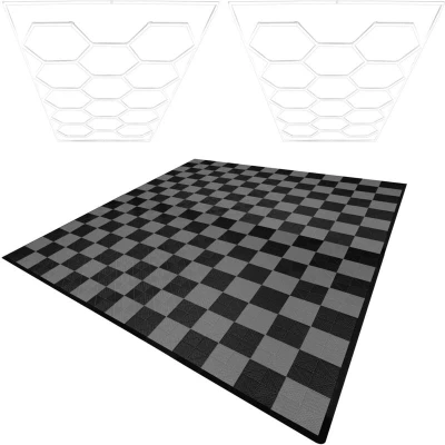 General description Transform your garage, workshop, or gym into a practical and visually stunning space with our premium vented garage floor tiles and innovative hexagon LED lighting bundle. This all-in-one solution combines strength, style, and functionality for a space you'll love to work in or show off. Technical specifications Garage Floor Tiles: Colour: Black & Grey Weight Per Tile: 0.5 kg Total Weight: 126.2 kg Material: 100% Polypropylene Height Per Tile: 18 mm / 1.8 cm / 0.7” Width Per Tile: 400 mm / 40 cm / 15.7” Depth Per Tile: 400 mm / 40 cm / 15.7” Assembled Width: 600 cm / 6 m / 126” Assembled Depth: 1200 cm / 6 m / 236.2” Configuration: 15 Tiles x 15 Tiles Capacity Per Tile: 5 Tonne Hexagon Lighting: Colour: White Weight: 16.6 kg Material: PVC Length: 486 cm / 4.86 m / 191.3” Width: 244 cm / 2.44 m / 96.1” Depth: 3.5 cm / 0.035 m / 1.4” Power: 6 W Voltage: 100-230 V AC Lumen: 110-120 Colour Temperature: 6500 K Light Working Temperature: 20-50 °C Environmental Working