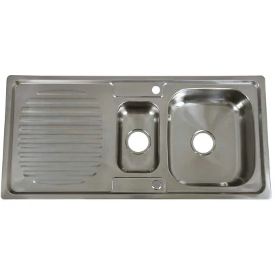 General description This Premium Stainless Steel Kitchen Sink from KuKoo combines practicality with aesthetic appeal, making it a perfect addition to your kitchen. Designed to last, this sink features robust construction and a shiny polished finish that enhances your kitchen decor without overshadowing it. Technical specifications Material: 0.9mm thick stainless steel Overall dimensions: approximately 1050mm x 500mm Required worktop cut-out: approximately 1030mm x 480mm Pre-punched tap holes: 35mm Compatibility and accessories Includes a plug-less basket strainer waste kit for both plug holes Comes with a FREE plumbing kit, tap hole cover plate, clips, and rubber sealing strips Installation Easy to install by slotting into a pre-cut hole in your worktop Fix in place using the provided clips Usage Push to seal and pull to release water with the basket strainer waste kit Can be fitted with either a left hand or right hand drainer based on your kitchen layout