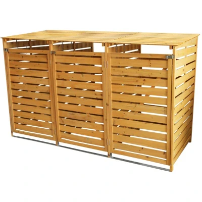 General description Create a stylish feature for your three otherwise ordinary 240L bins with MonsterShop’s beautiful, natural-looking wooden wheelie bin storage. This storage unit complements all garden settings, providing a wonderful space while keeping your bins in a practical location. Made from strong, long-lasting douglas-fir wood, the frame features a slatted design that helps filter air, maintaining a fresh smell in your garden. The bin store is perfectly designed to hold three standard 240L wheelie bins, but its versatility allows it to store other items such as firewood or essential garden tools. Technical specifications Height: 1200mm / 120cm / 1.2m Width: 1980mm / 198cm / 1.98m Depth: 810mm / 81cm / 0.81m Weight: 31.5Kg Colour: Brown Material: Fir Wood Style: Outdoor, Garden Assembly required: Yes Flat pack: Yes Number of doors: 3 Number of locks: 3 Capacity: 3 x Wheelie bins Installation Arrives flat-packed with quick and easy assembly. A free fixing kit is included to
