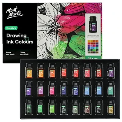 Mont Marte Drawing Ink Colors Signature 24pc x 0.24 US fl.oz (7ml), Art Set Includes Vibrant Colors, for Illustration, Calligraphy, Scrapbooking.