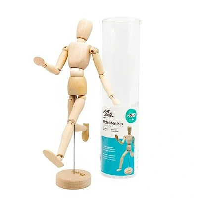 𝗔𝗗𝗝𝗨𝗦𝗧𝗔𝗕𝗟𝗘 𝗔𝗡𝗗 𝗙𝗟𝗘𝗫𝗜𝗕𝗟𝗘 – The Mont Marte Mannekin has movable joints to allow different adjustments. It can replicate different kinds of poses. Thanks to that, expressive and versatile drawings are easily achieved. 𝗩𝗘𝗥𝗬 𝗘𝗫𝗔𝗖𝗧 𝗣𝗥𝗢𝗣𝗢𝗥𝗧𝗜𝗢𝗡𝗦 – The limbs of this mannekin have been developed in proportion to an average human size and offer exact proportions to serve you as a realistic model. 𝗛𝗜𝗚𝗛-𝗤𝗨𝗔𝗟𝗜𝗧𝗬 𝗡𝗔𝗧𝗨𝗥𝗔𝗟 𝗪𝗢𝗢𝗗 – Due to the high quality of the materials used, the Mont Marte body doll is particularly sturdy and durable. It is also securely mounted on a stable stand. 𝗣𝗘𝗥𝗙𝗘𝗖𝗧 𝗙𝗢𝗥 𝗕𝗘𝗚𝗜𝗡𝗡𝗘𝗥𝗦 𝗔𝗡𝗗 𝗣𝗥𝗢𝗙𝗘𝗦𝗦𝗜𝗢𝗡𝗔𝗟𝗦 – This 30 cm high and male mannekin is an excellent drawing aid for beginners and professional artists. It is also suitable for making motion studies. 𝗜𝗗𝗘𝗔𝗟 𝗔𝗦 𝗔 𝗗𝗥𝗔𝗪𝗜𝗡𝗚 𝗧𝗘𝗠𝗣𝗟𝗔𝗧𝗘 – This manikin is ideal as a drawing template to show movements. It can be used in many ways and also looks great as a decoration on the desk.
