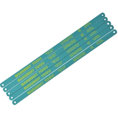 General description Pack of 5 Monument Hacksaw Blades made from high-speed steel (HSS). Each blade measures 300mm (12 inches) in length and features 24 teeth per inch (TPI), making them suitable for cutting various materials. Technical specifications Material: High-speed steel (HSS) Length: 300mm (12 inches) Teeth per inch: 24 TPI Pack quantity: 5 blades Compatibility and accessories Compatible with the Monument 1921D hacksaw frame Installation Insert the blade into the hacksaw frame ensuring it is securely fitted Adjust the tension of the blade as per the hacksaw's instructions Usage Use for cutting metal, plastic, or other materials suitable for hacksaw blades Ensure proper tension and correct blade orientation during use Other information