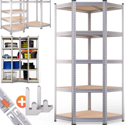 General description Sturdy heavy-duty corner shelf for optimal storage in your home and garage. Bring order to your garage, workshop, storage room, or cellar with the Monzana heavy-duty shelving. Crafted from premium galvanised steel, this storage rack is built to last. Equipped with five extra-large, eco-friendly MDF shelves, each level can bear a weight of up to 175 kg, offering a total load capacity of 875 kg. Experience hassle-free setup with the intelligent plug-in system—no screws required! The flexible design allows you to adjust the spacing between shelves according to your preferences. You can convert this versatile rack into a tall unit or two half-height shelving units, doubling it up as a workbench. Protect your floors from scratches using the eight provided plastic feet for both the top and bottom of the shelving unit. For added stability, each of the five levels features a central cross brace, ensuring maximum support, especially under heavy loads. The space-saving
