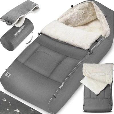 CUDDLY - The footmuff by MONZANA protects your child perfectly from the cold and can be used optimally for cold, wet autumn and winter days. The 90x60cm footmuff offers enough space and, thanks to its soft inner lining, feels pleasant on the skin. WARM HANDS - A fluffy hand warmer is included, so you don't get cold hands in cold temperatures. Like the footmuff, the snaps can be fully opened. There is also a zip on the sack, which means the sack can be used as a play mat. REFLECTIVE STRIPES - Reflective strips on the outside of the baby footmuff, which means that you and your baby are visible even in the darker months of the year. There is a pocket in the front area for storing small items such as pacifiers or wipes. VERSATILE USE - The winter footmuff is suitable for all standard prams, car seats, buggies and infant carriers. Thanks to the attachment slots, the bag can easily be attached with 3 and 5-point safety belts. Rubberised underside ensures a firm hold. WEATHERPROOF - The footmuff is weatherproof due to its robust material. Easy to clean and washable at 30°C. When not in use, the bag can be stowed away in a practical carry bag. Keep your baby warm and cosy, and enjoy the time outside.