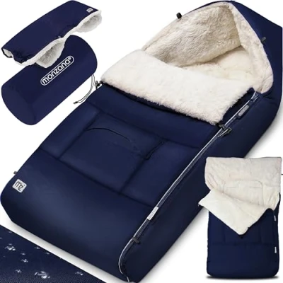 CUDDLY - The footmuff by MONZANA protects your child perfectly from the cold and can be used optimally for cold, wet autumn and winter days. The 90x60cm footmuff offers enough space and, thanks to its soft inner lining, feels pleasant on the skin. WARM HANDS - A fluffy hand warmer is included, so you don't get cold hands in cold temperatures. Like the footmuff, the snaps can be fully opened. There is also a zip on the sack, which means the sack can be used as a play mat. REFLECTIVE STRIPES - Reflective strips on the outside of the baby footmuff, which means that you and your baby are visible even in the darker months of the year. There is a pocket in the front area for storing small items such as pacifiers or wipes. VERSATILE USE - The winter footmuff is suitable for all standard prams, car seats, buggies and infant carriers. Thanks to the attachment slots, the bag can easily be attached with 3 and 5-point safety belts. Rubberised underside ensures a firm hold. WEATHERPROOF - The footmuff is weatherproof due to its robust material. Easy to clean and washable at 30°C. When not in use, the bag can be stowed away in a practical carry bag. Keep your baby warm and cosy, and enjoy the time outside.