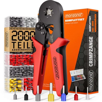 General description The MONZANA® Electricians Crimping Pliers Set is a comprehensive tool designed for efficient crimping of wire end sleeves. This set includes robust crimping pliers and a 2000-piece assortment of wire end sleeves, making it ideal for both professional electricians and DIY enthusiasts. The ergonomic design ensures comfort during use, while the anti-slip coating provides a secure grip. Technical specifications Ferrule box size (LxH): 20x11x3 cm Pliers material: carbon steel Colour: Blue-Red Wire end sleeve sizes: 0.25-10 mm² Package contents: 1x Crimping pliers, 450x E1508 (black), 300x E2508 (blue), 450x E0508 (white), 300x E7508 (grey), 390x E1008 (red), 50x E4009 (grey), 35x E6012 (yellow), 25x E10-12 (red), Storage bag Usage The crimping pliers are designed for easy handling and fit comfortably in the hand, making them suitable for everyday use. The pressing unit automatically adjusts to the size of the insulating sleeves, ensuring consistent and high-quality