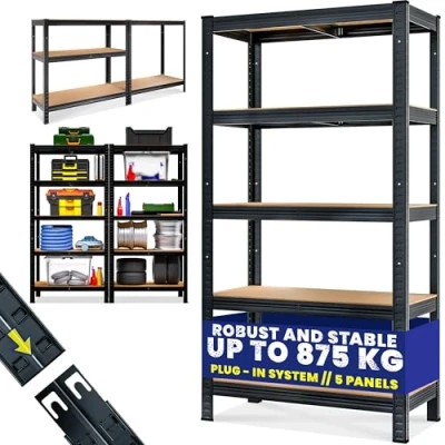 5 TIER GARAGE SHELVING UNITS : Our storage shelves offer a versatile 5 tier design, perfect for maximising space in your garage or workshop. With dimensions of 180x90x40cm, these garage shelving units ensure ample room for all your garage storage needs. HEAVY DUTY CONSTRUCTION : Crafted from galvanised steel, this shelf unit provides exceptional durability and stability. This metal shelving unit is designed for heavy duty use, making it ideal for storing tools, equipment, and other garage essentials. BOLTLESS ASSEMBLY : Enjoy the convenience of boltless assembly with this garage storage solution. The no drill shelf design ensures quick and easy setup, allowing you to efficiently organise your workshop, shed, garage, or under stairs storage space without the need for tools or shelf brackets heavy duty. ENHANCED STABILITY: Safeguard your floors from scratches using the provided plastic feet for both the top and bottom of the metal garage shelving unit. For added stability, each of the five levels features a central cross brace, ensuring maximum support, especially under heavy loads. there are also holes in the shelves for wall fixings. ensuring stability. GALVANISED STEEL DURABILITY : Constructed from galvanised steel, the shelving units for storage ensure long-lasting performance. These metal garage shelving units resist corrosion, making them suitable for shed and greenhouse use, including garden shelving and shed shelving.
