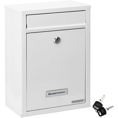 General description This lockable letterbox by MONZANA is designed for enhanced moisture and weather protection, constructed from galvanised steel. Its compact size makes it ideal for narrow wall surfaces, while its timeless and minimalistic design ensures it fits seamlessly into any environment. The mailbox features a rotary cylinder lock for security, complete with two keys, and includes a weather-resistant viewing window for a name sign that can be easily fixed from the inside without the need for glue or special paper. A protective cover prevents rain from entering, keeping your mail dry. Technical specifications Dimensions: (WxHxD) 22 x 32 x 9 cm Slot dimensions (WxH): 18 x 3 cm Emptying lid dimensions (WxH): 18 x 23.5 cm Viewing sign dimensions (WxH): 9 x 3 cm Material: Galvanised Steel Available colors: Black, White, Silver Installation Mounting requires 4 screws (included) on a flat wall surface. 4 pre-drilled mounting holes for easy installation. Recommended installation in a