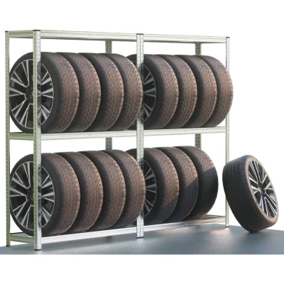 ManoManoGeneral description Create a more organised space in your garage with the MONZANA® Set of 2 Tyre Racks. This heavy-duty shelving unit features three sturdy levels, each with a load capacity of 265 kg, allowing for a total capacity of 795 kg per rack when weight is evenly distributed. The top shelf is made from durable MDF, ideal for storing tools or accessories, while the two lower levels provide ample space for up to 8 tyres. The assembly is quick and easy thanks to the slot-in design, and the fully galvanised steel frame ensures lasting strength. Technical specifications Dimensions (H x W x D): 180 x 120 x 40 cm Number of levels: 3 Shelf material: MDF Frame material: Fully galvanised steel Load per level: 265 kg Total load: 795 kg (evenly distributed) Compatibility and accessories Includes 2x Tyre Storage Racks 16x Plastic Feet 2x MDF Shelves Metal supports and connectors Rubber guards Installation Quick and easy assembly with slot-in system Suitable for wall mounting Usage Store up
