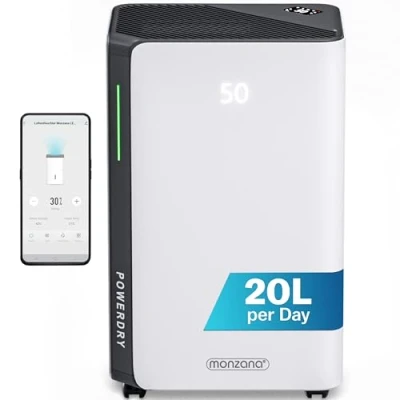 POWERFUL 20L SMART DEHUMIDIFIER FOR HOME – Efficiently extracts up to 20L of moisture daily, preventing damp, mould, and condensation. Ideal dehumidifier for bedroom, bathroom, laundry room, or basement. Improves air quality in spaces up to 30m² with quiet, energy-efficient performance. Great condensation absorbers. ENERGY EFFICIENT PERFORMANCE – COSTS AS LOW AS 6p PER HOUR – Designed with a powerful yet low-consumption 330W compressor, this energy efficient dehumidifier removes excess moisture while cutting running costs. Ideal eco-friendly solution for home, laundry, and bedroom use. SMART APP & WIFI CONTROL WITH AUTO SENSOR – Easily connect this smart dehumidifier to WiFi or a smartphone app to monitor humidity, set timers, or enable laundry drying mode. The built-in humidity sensor automatically maintains 30–80% RH for perfect comfort in any room. It can be a dehumidifier for drying clothes. QUIET OPERATION & SLEEP MODE – Enjoy undisturbed comfort with this ultra-quiet dehumidifier operating at just 36dB. Perfect for bedrooms, nurseries, and offices, it maintains clean, fresh air while preventing damp and mould — ideal for silent overnight use. Ideal condensation absorbers for windows. AIR PURIFIERS FUNCTION & CONTINUOUS DRAINAGE – This 2-in-1 dehumidifier and air purifier features a washable allergen filter and drain hose for continuous use. The LED display, 24-hour timer, and colour light bar make humidity control simple and efficient., Weight: 30.2253761202 Pounds, Manufacturer: Monzana