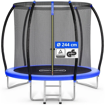 General description The high-quality Monzana trampoline is specially designed for outdoor use, providing a fun and safe environment for children to train coordination, agility, body control, and body tension. The internal, close-meshed safety net ensures a high level of safety by preventing contact between the net and the metal springs of the steel frame. All components are designed for durability and are water and weather-resistant. Technical specifications Frame diameter: 244 cm or 305 cm Frame height: 55 cm or 76 cm (depending on model) Maximum load capacity: 150 kg Jumping mat material: 100% polypropylene Internal net height: 180 cm Frame tubes: 6 or 8 (depending on model) Springs: 48 or 64 (depending on model) Legs: 3 or 4 (depending on model) Rod dimensions: 25 x 1.2 mm Compatibility and accessories Includes 1 trampoline 1 spring compressor 1 ladder