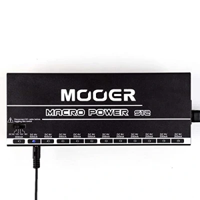 The MACRO POWER S12 from MOOER is a high output professional pedalboard power supply Sporting 2 toroidal transformers and 12 completely independent outputs the MACRO S12 can deliver up to 3. 4 Amps (3400mA) of clean, quiet and consistent DC power for all of your pedal power needs 6 x 200mA 9V outputs for all your favourite analog pedals; 3 x 300mA 9V outputs for your preamps and digital pedals 1 x 300mA output with selectable voltage (9V, 12V, 15V, 18V); 2 x 500mA 9V outputs for powering your current hungry monster pedals; Switchable input voltage for use in different regions across the globe All of this is crammed into a tour ready metal housing and comes packaged with all the cables you need to get up and running