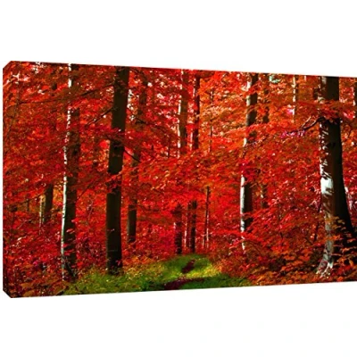 Beautiful autumn red forest scene Quality Canvas print, hand stretched around a wooden frame, manufactured in the UK by MOOL Printed on High Quality Waterproof Canvas and coated with protective varnish to inhibit Ultra Violet fade and yellowing of your canvas Comes complete with taped backing and hanger to make mounting your canvas quick and easy Size 32" x 22" x 0.71" (81cm x 56cm x 2cm)