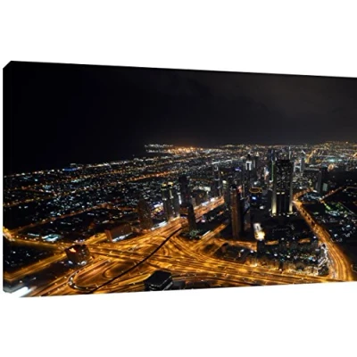 Dubai at night atop the Burj Khailfa Quality Canvas print, hand stretched around a wooden frame, manufactured in the UK by MOOL Printed on High Quality Waterproof Canvas and coated with protective varnish to inhibit Ultra Violet fade and yellowing of your canvas Comes complete with taped backing and hanger to make mounting your canvas quick and easy Size 32" x 22" x 0.71" (81cm x 56cm x 2cm)