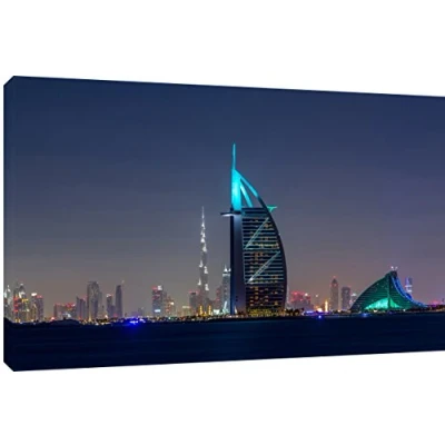 Dubai iconic buildings at blue hour Quality Canvas print, hand stretched around a wooden frame, manufactured in the UK by MOOL Printed on High Quality Waterproof Canvas and coated with protective varnish to inhibit Ultra Violet fade and yellowing of your canvas Comes complete with taped backing and hanger to make mounting your canvas quick and easy Size 32" x 22" x 0.71" (81cm x 56cm x 2cm)