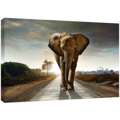 Stunning photo of an Elephant walking along a road Quality Canvas print, hand stretched around a wooden frame, manufactured in the UK by MOOL Printed on High Quality Waterproof Canvas and coated with protective varnish to inhibit Ultra Violet fade and yellowing of your canvas Comes complete with taped backing and hanger to make mounting your canvas quick and easy Size 32" x 22" x 0.71" (81cm x 56cm x 2cm)