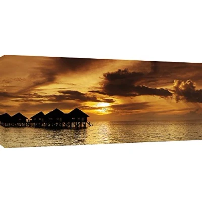 Extra wide Panoramic photo of a beautiful tropical sunset with water villas. Quality Canvas print, hand stretched around a wooden frame, manufactured in the UK by MOOL Printed on High Quality Waterproof Canvas and coated with protective varnish to inhibit Ultra Violet fade and yellowing of your canvas Comes complete with taped backing and hanger to make mounting your canvas quick and easy Size 42" x 20" x 0.71" (106cm x 51cm x 2cm)