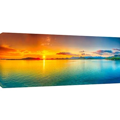 Extra wide Panoramic photo of a Ocean Sunrise Quality Canvas print, hand stretched around a wooden frame, manufactured in the UK by MOOL Printed on High Quality Waterproof Canvas and coated with protective varnish to inhibit Ultra Violet fade and yellowing of your canvas Comes complete with taped backing and hanger to make mounting your canvas quick and easy Size 42" x 20" x 0.71" (106cm x 51cm x 2cm)