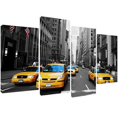 MOOL 51 x 28 Inch Large 4 Piece Classic Yellow Taxi in New York with a black & white backdrop Panel Canvas Print Ready to Hang