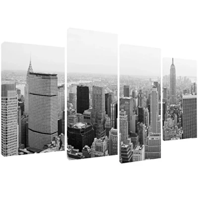 New York City Manhattan skyline in black & white Quality Canvas print, hand stretched around a wooden frame, manufactured in the UK by MOOL Printed on High Quality Waterproof Canvas and coated with protective varnish to inhibit Ultra Violet fade and yellowing of your canvas Comes complete with taped backing and hangers to make mounting your canvas quick and easy Centre Panels 26x12 inches (66x30cm) Outer Panels 20x12 inches (50x30cm). Wall Space Required 51x28 inches (130x71cm)