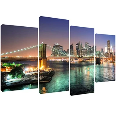 MOOL 51 x 28 Inch Large 4 Piece Stunning midnight new york city scene photo with relaxing pink sunset Panel Canvas Print Ready to Hang