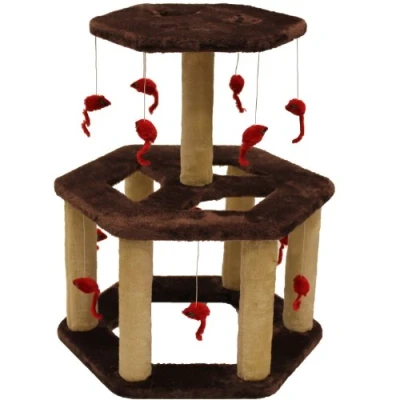 Our 3 tier cat scratching tree and activity centre is lots of fun for cats of all ages. its hexagonal design makes it extra stable however hard your cat jumps on it. This comes with 12 colourful mice that your cat will love clawing at. Made from a hardwearing brown and beige plush material and will give your cats hours of fun whether they choose to play on it or just relax. Product size: 55 x 55 x 122cm Item - h= 65cm w= 54cm d= 48cm / first and second level = 54cm x 48cm, top level = 38cm x 35cm