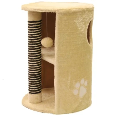 This beautifully crafted cat scratching tree comes with a full length scratching post. there's plenty of room on the top of this too so your cat can relax and survey it's surroundings. Half way up your cat can gain access to the inner shelf where it can lie down and relax in safety or play with the hanging ball if it's full of energy. Made from a hardwearing plush cream material with paw print motif this is suitable for cats of all ages. Hidey shelf h=25.5cm w=40cm d=40cm/ window hole diameter= 15cm Product size: 41 x 58cm