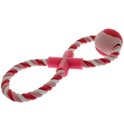 Figure 8 rope tug toy Great fun either as a throwing toy or for a game of tug of war. Hardwearing circular rope construction complete with colour co-ordinated ball attached. Size: 36cm (14 inch)