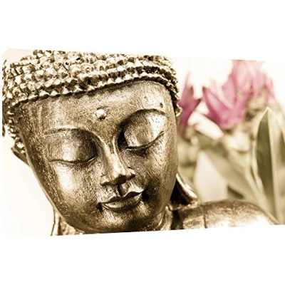 Golden buddha face close up Quality Canvas print, hand stretched around a wooden frame, manufactured in the UK by MOOL Printed on High Quality Waterproof Canvas and coated with protective varnish to inhibit Ultra Violet fade and yellowing of your canvas Comes complete with taped backing and hanger to make mounting your canvas quick and easy Size 32” x 22” x 0.71” (81cm x 56cm x 2cm)