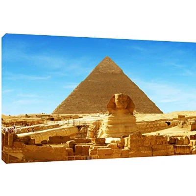 Panorama of the Sphinx and the great Pyramid at Giza in Egypt Quality Canvas print, hand stretched around a wooden frame, manufactured in the UK by MOOL Printed on High Quality Waterproof Canvas and coated with protective varnish to inhibit Ultra Violet fade and yellowing of your canvas Comes complete with taped backing and hanger to make mounting your canvas quick and easy Size 32” x 22” x 0.71” (81cm x 56cm x 2cm)