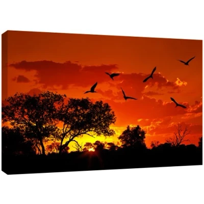 Beautiful photo of a African vibrant sunset with bird landscape Quality Canvas print, hand stretched around a wooden frame, manufactured in the UK by MOOL Printed on High Quality Waterproof Canvas and coated with protective varnish to inhibit Ultra Violet fade and yellowing of your canvas Comes complete with taped backing and hanger to make mounting your canvas quick and easy Size 32" x 22" x 0.71" (81cm x 56cm x 2cm)
