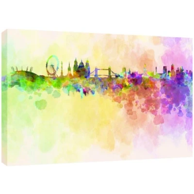 Beautiful Modern picture of London's famous skyline packed with variety of stunning watercolours Quality Canvas print, hand stretched around a wooden frame, manufactured in the UK by MOOL Printed on High Quality Waterproof Canvas and coated with protective varnish to inhibit Ultra Violet fade and yellowing of your canvas Comes complete with taped backing and hanger to make mounting your canvas quick and easy Size 32" x 22" x 0.71" (81cm x 56cm x 2cm)