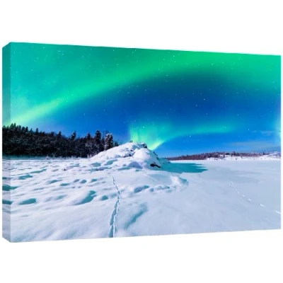 Beautifully stunning Northern lights landscape with subtle shimmers of green Quality Canvas print, hand stretched around a wooden frame, manufactured in the UK by MOOL Printed on High Quality Waterproof Canvas and coated with protective varnish to inhibit Ultra Violet fade and yellowing of your canvas Comes complete with taped backing and hanger to make mounting your canvas quick and easy Size 32" x 22" x 0.71" (81cm x 56cm x 2cm)
