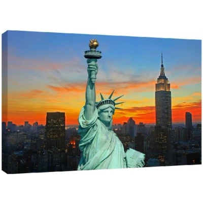 Stunning picture of the Statue of Liberty illuminted on a sunset of newyorks skyline Quality Canvas print, hand stretched around a wooden frame, manufactured in the UK by MOOL Printed on High Quality Waterproof Canvas and coated with protective varnish to inhibit Ultra Violet fade and yellowing of your canvas Comes complete with taped backing and hanger to make mounting your canvas quick and easy Size 32" x 22" x 0.71" (81cm x 56cm x 2cm)