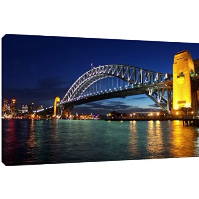 Sydney Harbour Bridge just before sunset Quality Canvas print, hand stretched around a wooden frame, manufactured in the UK by MOOL Printed on High Quality Waterproof Canvas and coated with protective varnish to inhibit Ultra Violet fade and yellowing of your canvas Comes complete with taped backing and hanger to make mounting your canvas quick and easy Size 32" x 22" x 0.71" (81cm x 56cm x 2cm)