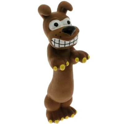 Superb dog shaped pet toy complete paws and beaming smile. complete with built in squeaker. Great for chasing, burying or just plain chewing! Made from hardwearing latex for longevity. Size: 23cm (9.1 inch)