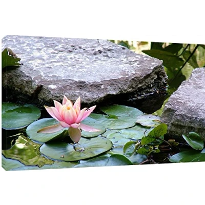 A pond lily sits among some stepping stones through a pond. Quality Canvas print, hand stretched around a wooden frame, manufactured in the UK by MOOL Printed on High Quality Waterproof Canvas and coated with protective varnish to inhibit Ultra Violet fade and yellowing of your canvas Comes complete with taped backing and hanger to make mounting your canvas quick and easy Size 32” x 22” x 0.71” (81cm x 56cm x 2cm)