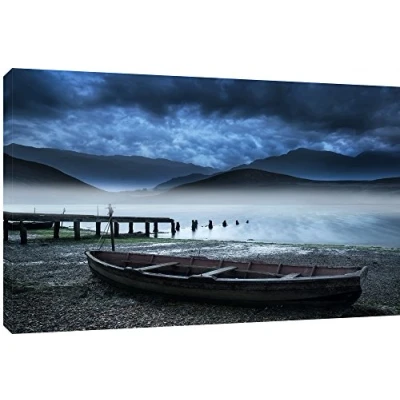 Stormy sky landscape over misty mountain lake with old boat on lake shore Quality Canvas print, hand stretched around a wooden frame, manufactured in the UK by MOOL Printed on High Quality Waterproof Canvas and coated with protective varnish to inhibit Ultra Violet fade and yellowing of your canvas Comes complete with taped backing and hanger to make mounting your canvas quick and easy Size 32” x 22” x 0.71” (81cm x 56cm x 2cm)