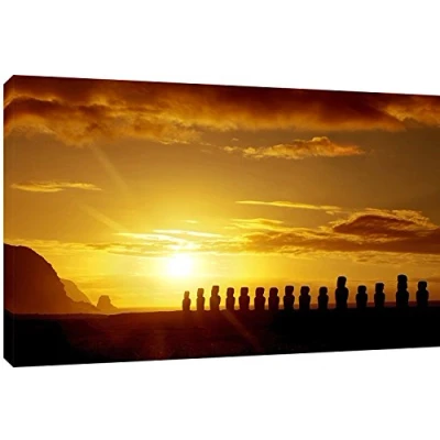 Mysterious stone statues at sunrise in Easter Island Quality Canvas print, hand stretched around a wooden frame, manufactured in the UK by MOOL Printed on High Quality Waterproof Canvas and coated with protective varnish to inhibit Ultra Violet fade and yellowing of your canvas Comes complete with taped backing and hanger to make mounting your canvas quick and easy Size 32” x 22” x 0.71” (81cm x 56cm x 2cm)