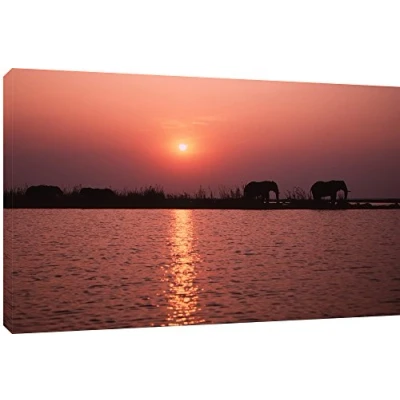 African elephants silhouetted against the setting sun in Zimbabwe Quality Canvas print, hand stretched around a wooden frame, manufactured in the UK by MOOL Printed on High Quality Waterproof Canvas and coated with protective varnish to inhibit Ultra Violet fade and yellowing of your canvas Comes complete with taped backing and hanger to make mounting your canvas quick and easy Size 32” x 22” x 0.71” (81cm x 56cm x 2cm)