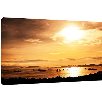 Sunset at sea with silhouettes boat fishing, Thailand Quality Canvas print, hand stretched around a wooden frame, manufactured in the UK by MOOL Printed on High Quality Waterproof Canvas and coated with protective varnish to inhibit Ultra Violet fade and yellowing of your canvas Comes complete with taped backing and hanger to make mounting your canvas quick and easy Size 32” x 22” x 0.71” (81cm x 56cm x 2cm)