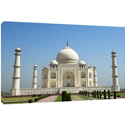 A blue sky rises above the Taj Mahal in Agra, India. The mausoleum is a popular tourist attraction for people on vacation or holiday Quality Canvas print, hand stretched around a wooden frame, manufactured in the UK by MOOL Printed on High Quality Waterproof Canvas and coated with protective varnish to inhibit Ultra Violet fade and yellowing of your canvas Comes complete with taped backing and hanger to make mounting your canvas quick and easy Size 32” x 22” x 0.71” (81cm x 56cm x 2cm)